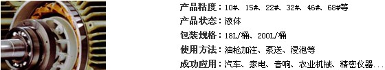 1、特別適用于高速高溫電機(jī)含油軸承的補(bǔ)充潤滑; 也可作為含油軸承廠商初裝油以及終身潤滑。