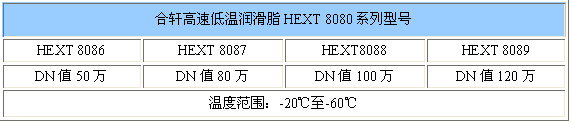 合軒HEXT 8060高速低溫潤滑脂分為多款產(chǎn)品,滿足溫度在-20℃至-60℃低溫范圍內(nèi)潤滑防凍需求,DN值有50萬、80萬、100萬、120萬等,高效解決軸承高轉(zhuǎn)速甩落,飛濺難題,多面體多元化,集合潤滑、防銹、防腐、防凍、抗磨等多種性能,質(zhì)量優(yōu)、效果保證,值得選購哦!
