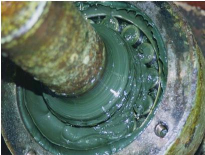 潤(rùn)滑脂成銹黃色呈膠體狀,并且軸承外圈明顯干涸變白,經(jīng)了解該潤(rùn)滑脂原來顏色為黃色??赏茢嘣谄淙缓筮^程中因軸承生銹,摩擦沒有得到很好的控制導(dǎo)致油脂和銹跡混合變色。
