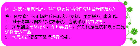 | 答:這次主要是解決冬季常見的潤(rùn)滑油脂結(jié)冰結(jié)凍的問(wèn)題,主要是戶外作業(yè)的設(shè)備和極端天氣情況運(yùn)轉(zhuǎn)的設(shè)備。 |